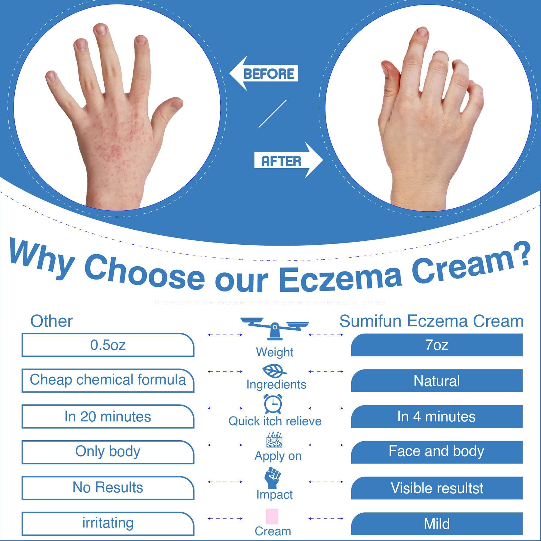 - ✔ 3 Hours Effective Antipruritic:Sumifun eczema cream is formulated to speed healing of damaged skin and ease dryness and itching. Hydration and Protection SKIN.Have a good life. Many customers have experienced relief from discomfort in as little as 3 hours and a noticeable improvement within 3 days!