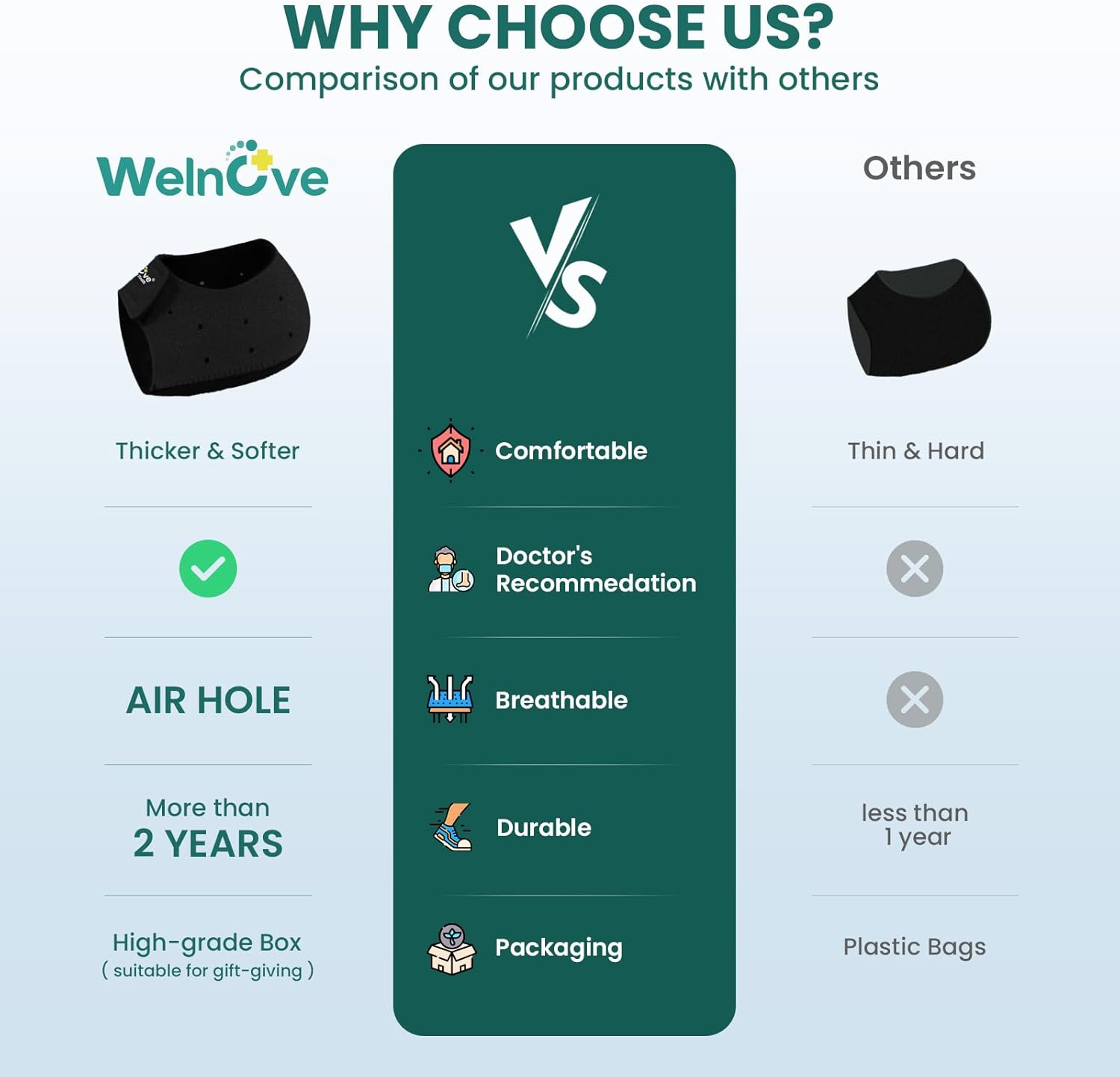 - UPGRAGE DESIGN - The upgraded heel protector with "air holes" is more breathable and moisture-wicking, keeping your feet nice and comfort. Made of skin-friendly fabric providing better fit, Welnove plantar fasciitis heel cups not easily wear down and it can take the impact off the area, providing persistent cushioning and support.